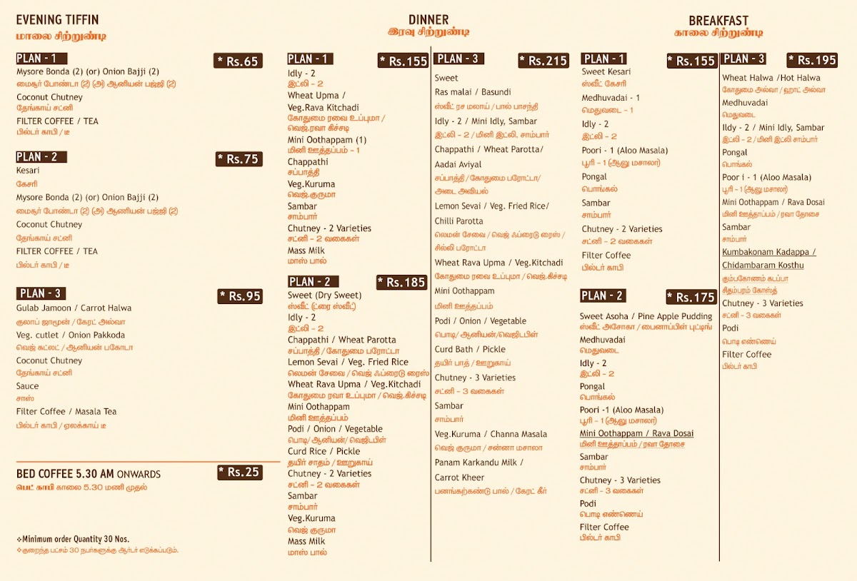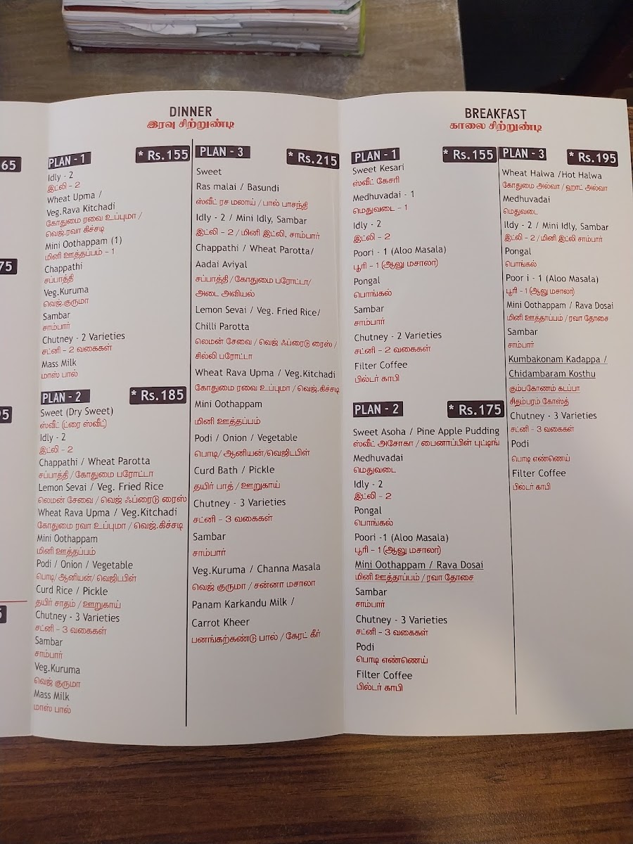 For lunch and dinner, the menu showcases a plethora of vegetarian options, including homely rice and delicious curries that reflect the true spirit of Tamil Nadu's culinary heritage. The freshness of ingredients and the cleanliness of the place contribute to an overall satisfying dining experience.